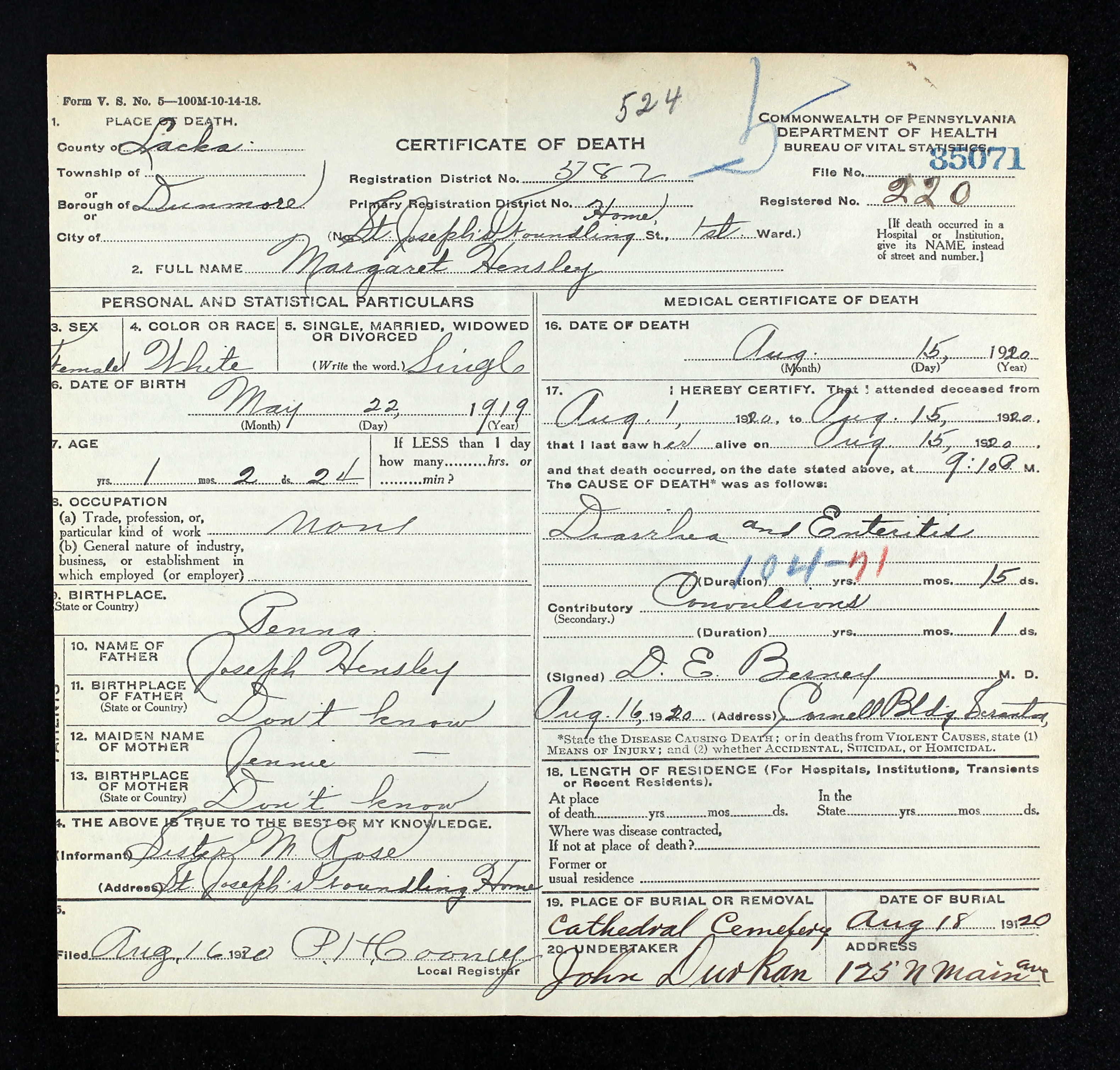 While doing some research on Ancestry.com, I came across a hit for Margaret Hensley. It was a death certificate.