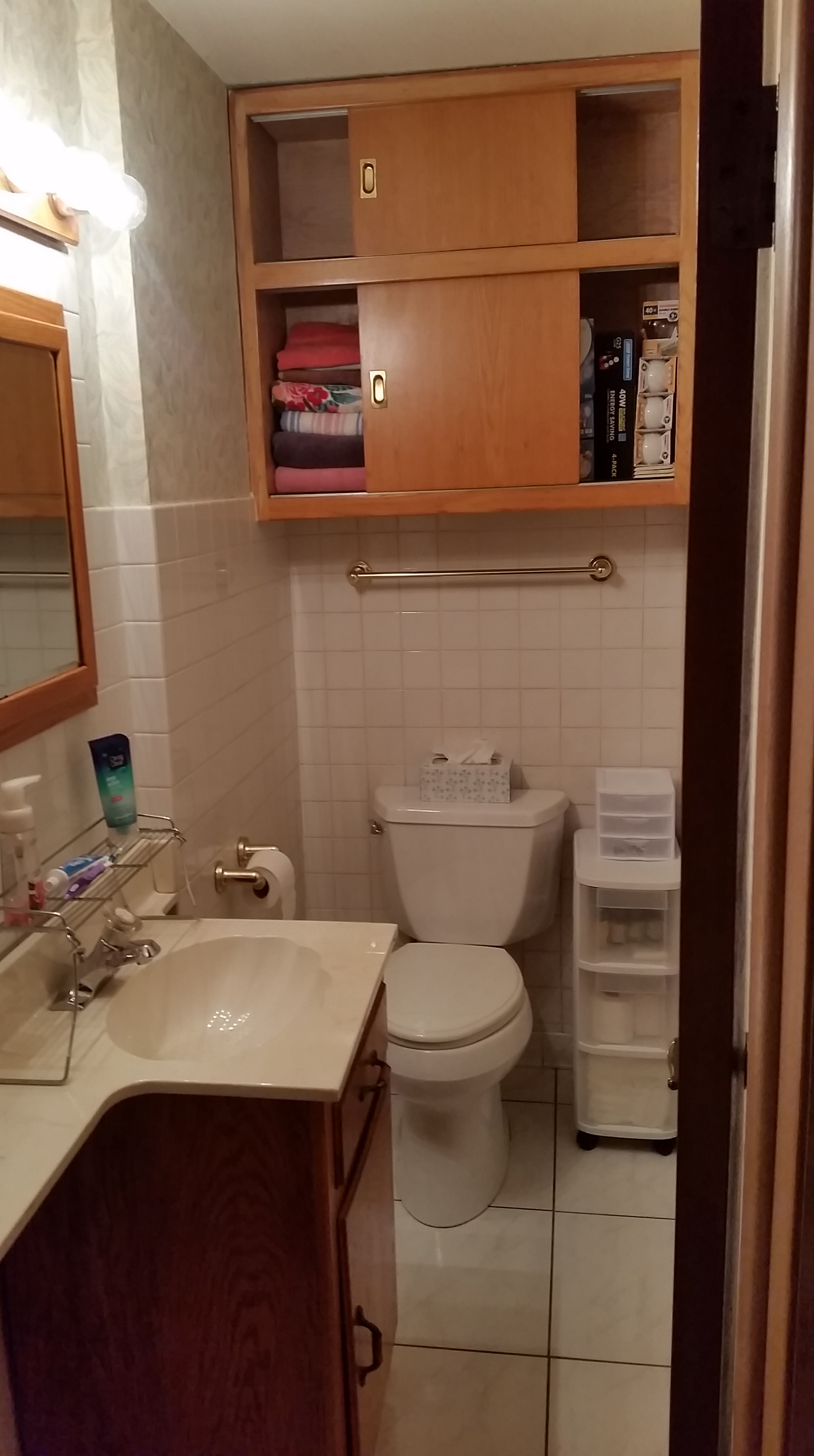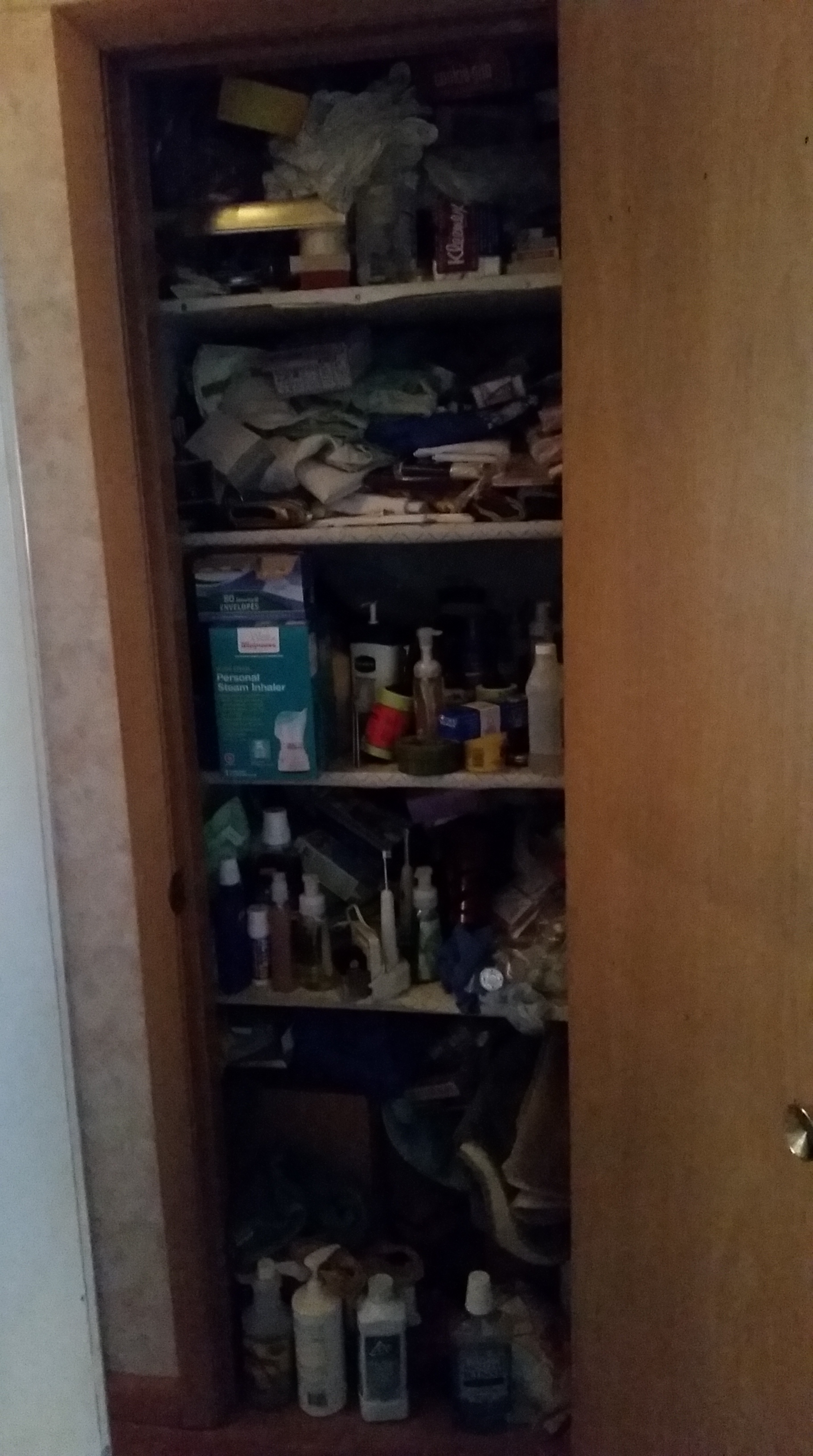 The next project was the small bathroom/powder room. This was tough. The cabinets above the commode were jam-packed with stuff. I had to be careful sliding the doors open because stuff would fall out. And there was still epoxy on the commode and tile floor from when it was installed. So I had to get on my hands and knees to scrub everything. The room is very narrow and there isn’t a lot of space, so my back wasn’t too pleased with me. And those cabinets are really high up – I’m 5’11” and I needed to get on a chair to reach the upper shelf. But I got it done!