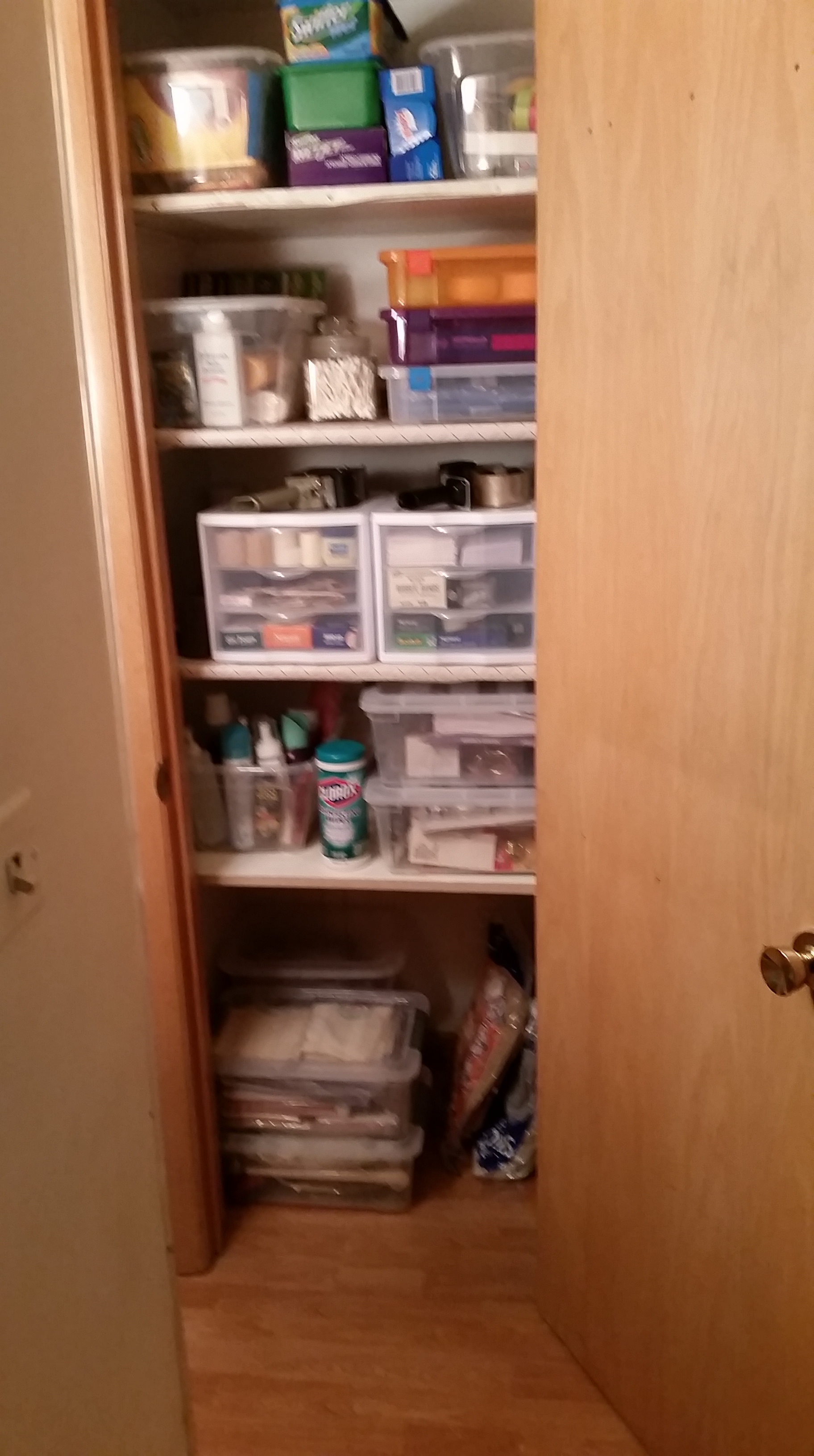 I started with the linen closet. This is something that I’ve wanted to do for a while. I knew that things I needed where in there – somewhere. The last couple of times a friend visited me this year, we said, “Okay. We’re going to do that linen closet.” Yeah, that didn’t happen. But I got so motivated by this group of intrepid declutterers! One day, I just started taking everything out of the linen closet. It took over my living room and it took me 2 days. But I ended up with 3 – 33 gallon bags of trash, 7 boxes of things to donate, and a number of things to give to my cousin to help him and his fiance furnish their new home.
